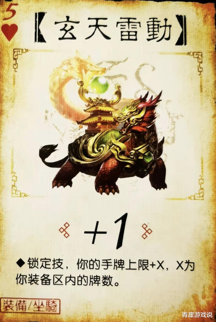 玄天雷动,+1坐骑。玄天雷动虽然没有+2防御,但附带了增加装备数量手牌上限的被动效果。假设一位武将满装备,那便会多出四点手牌上限!即使是只装备玄天雷动一个装备,也有额外效果,简直是防御坐骑的典型之作。