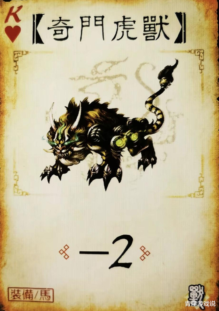 奇门虎兽,-2坐骑。和五色火牛的防御能力相反,奇门虎兽则是对应着进攻。-2距离相当于具备3点进攻距离,不占用武器格子,再搭配上武器牌,攻击距离覆盖全场!虽然攻击坐骑实用性低于防御坐骑,但是谁会拒绝骑着一匹老虎呢?