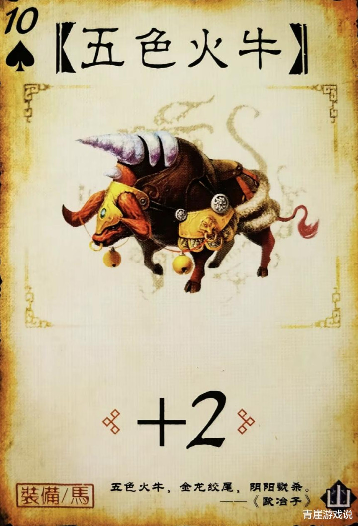 五色火牛,+2坐骑。普通的+1坐骑已经被玩家们誉为+1神马,那五色火牛这种+2呢?意味着其他人必须具有3攻击距离以上的武器才能碰得到你。五色火牛,它有纯粹的强力防御数值,是不得多的防御神器!